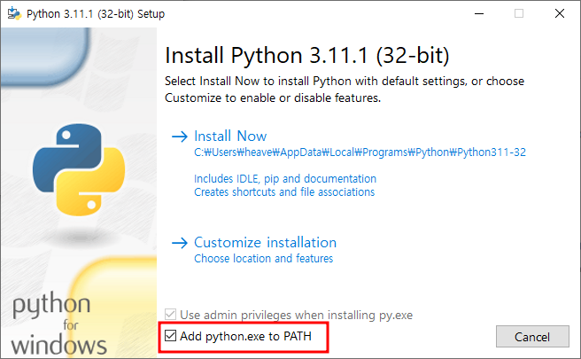 4.파이썬 설치 - Add python.exe to PATH 항목을 체크하여 자동으로 패스가 잡히게 해줍니다.